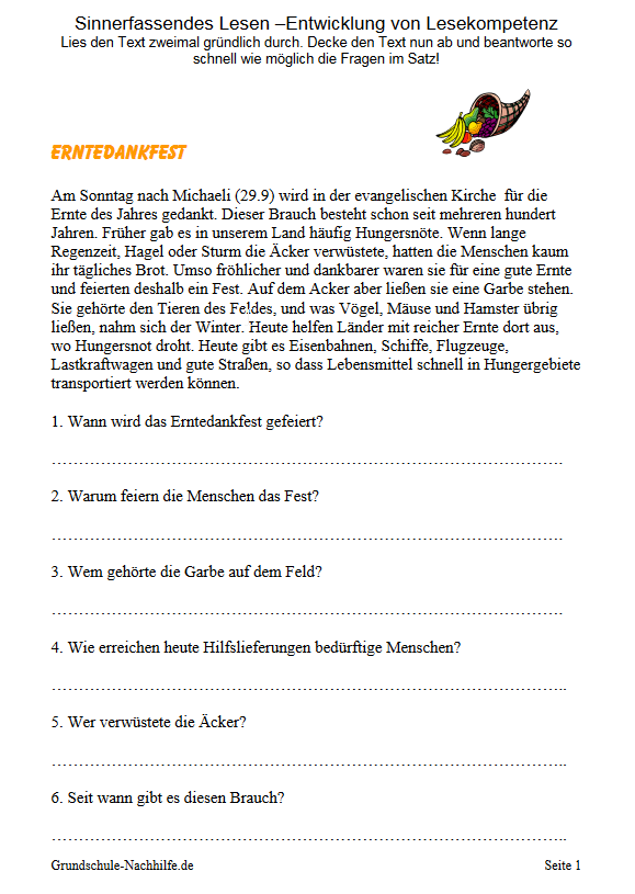 • Arbeitsblatt Nachhilfe Deutsch Klasse 3 und 4 Sinnerfassendes Lesen-„Erntedankfest“