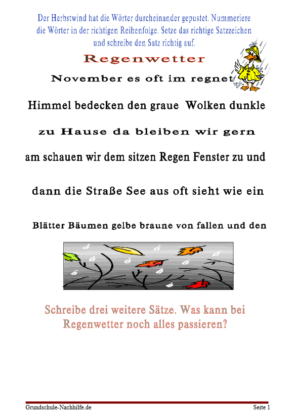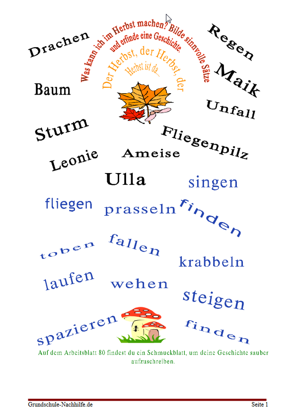 Phantasiereiche Geschichten zu einem Thema zu schreiben, fällt vielen Kindern schwer. Auf diesem Übungsblatt gibt es vorgefertigte Sätze, die der Herbstwind durcheinander gepustet hat. Diese Wörter müssen zu Sätzen sortiert werden. Es wird die Lesefertigkeit und das sinnerfassende Lesen geübt. Dann werden die Kinder aufgefordert, die Geschichte weiter zuerzählen.