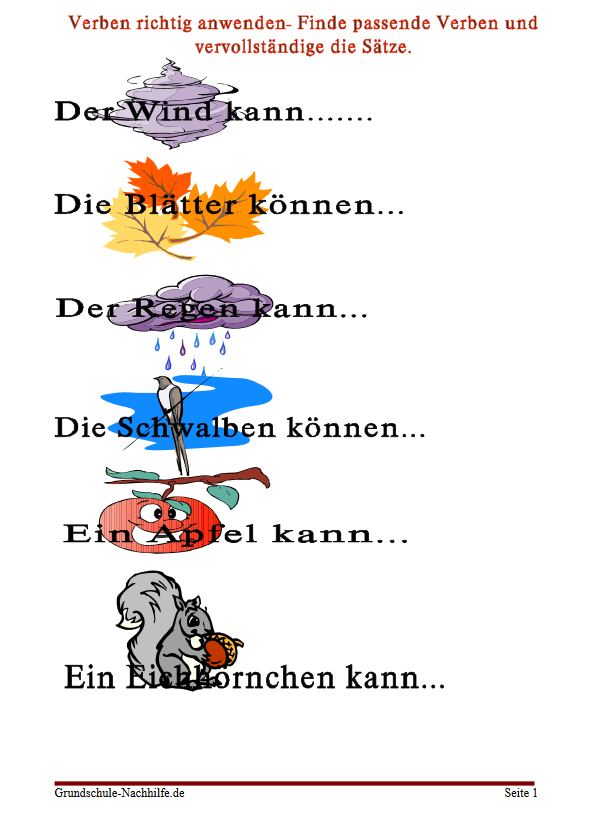 Phantasie und Ideenreichtum sind gefragt, wenn viele verschiedene Verben gefunden werden müssen. Bevor das Kind die Sätze in ein Übungsheft schreibt, kann es auf dem Blatt erst einmal die Verben hinter die Punkte sammeln. Ganz fleißige Kinder können im Anschluss aus den Sätzen noch eine Herbstgeschichte in einer verschiedenen Zeitformen (Präsens oder Präteritum) schreiben. Ein schönes Herbstbild zum Ferienausklang rundet das Übungsprogramm ab und mit einem guten Gewissen kann die Schulzeit wieder beginnen