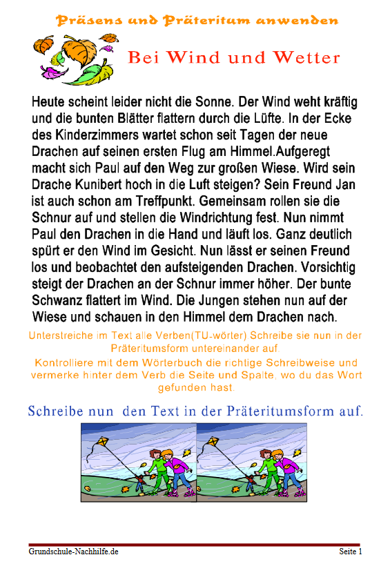 • Arbeitsblatt Nachhilfe Deutsch Klasse 3 „Bei Wind und Wetter“ Präsens und Präteritum