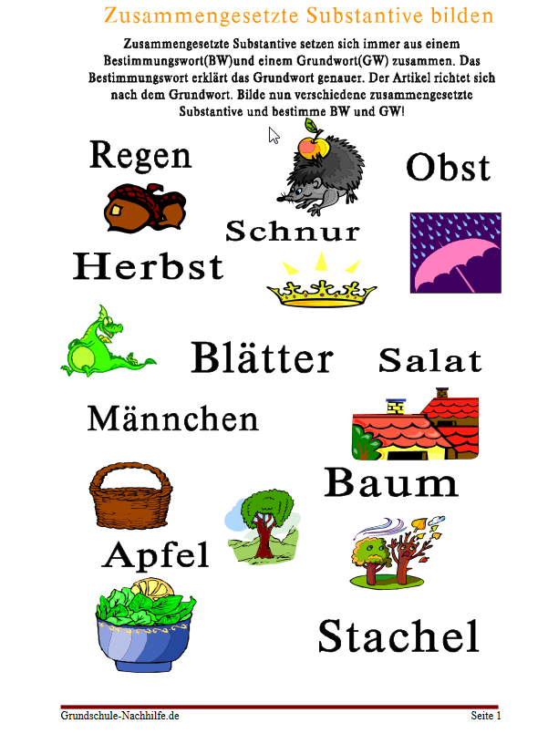 Herbstliche Substantive werden mit Hilfe der Wörter und Bilder gefunden. Nebenbei wiederholen die Kinder die Bedeutung von Grund –und Bestimmungswort.Nutze zum Aufschreiben und Bestimmen dein Übungsheft.
