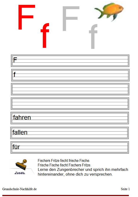 Mit einem bekannten Zungenbrecher kann die Lust zum Schreiben des F, f lustig vorangehen. Immer wenn drei oder fünf Buchstaben geschrieben sind, ist abwechselnd Mutti oder Kind dran ohne Versprecher den Spruch aufzusagen. Viel Spaß beim Üben!