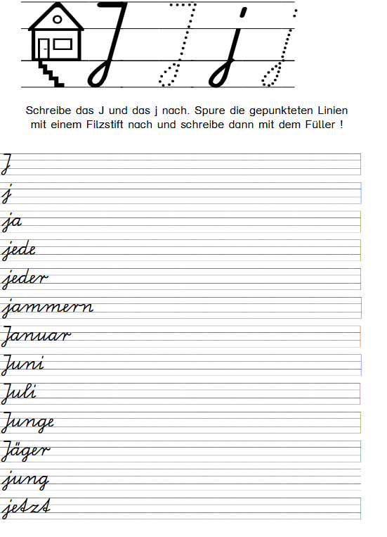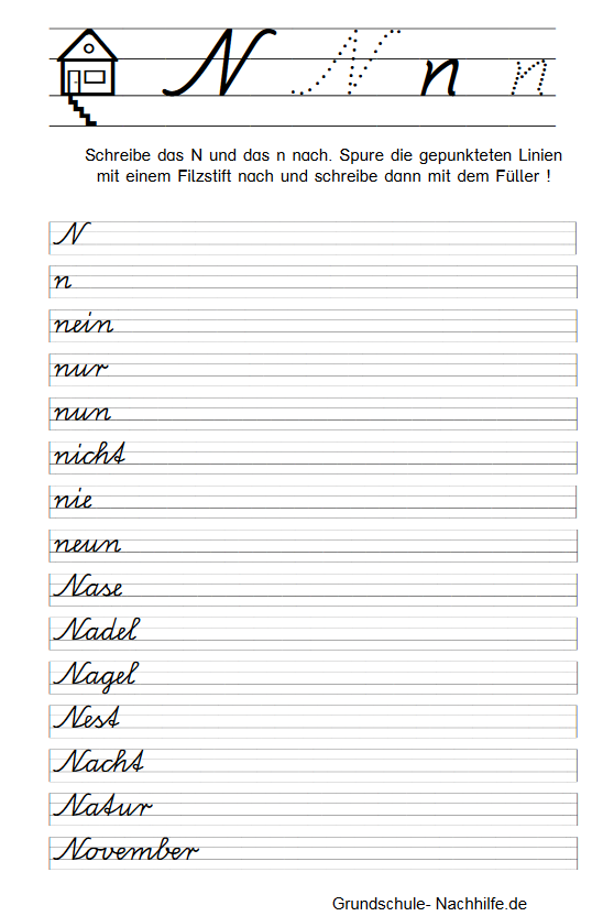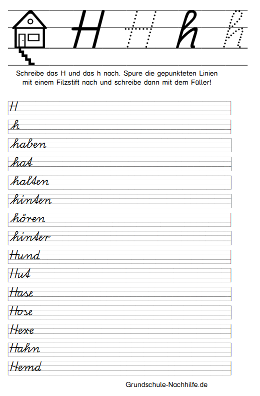 Zu Beginn der Übung sollte der Schüler immer erst den gepunkteten Buchstaben mit einem Filzstift nachspuren. Nachspuren heißt der Begriff, mit dem wir das Nachschreiben einer vorgegebenen Grundform (Buchstabe) bezeichnen. Zu Beginn der Linie finden wir ein Haus mit seinen drei bewohnbaren Etagen- Keller, Wohnstube, Dachboden. Unsere Buchstaben können in allen Etagen „wohnen“ (f) oder sie wohnen nur in der Wohnstube (a). In der Wohnstube und im Dachboden wohnen alle großen Buchstaben und einige kleine Schreibbuchstaben (l, k). Achten Sie auf die Einhaltung der entsprechenden „Wohnräume“!