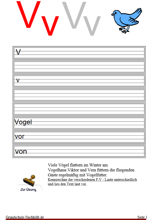 Der Buchstabe V, v ist erfahrungsgemäß ein Buchstabe, der so manches Rechtschreibproblem im Laufe des Schülerlebens mit sich bringt. Unter dem bekannten Spitznamen „Vogel-V“ lernen die Kinder diesen Buchstaben kennen und mit ihm die Wörter, die man sich ganz einfach in ihrer Schreibung einprägen muss. Unterscheiden Sie bewusst zwischen F- Wörtern und V- Wörtern und veranstalten Sie einen kleinen Wettbewerb. Schreiben Sie Wörter ohne Anfangsbuchstaben auf und lassen Sie das Kind entscheiden und eintragen, ob F, f oder V, v.