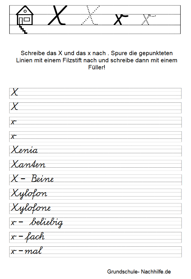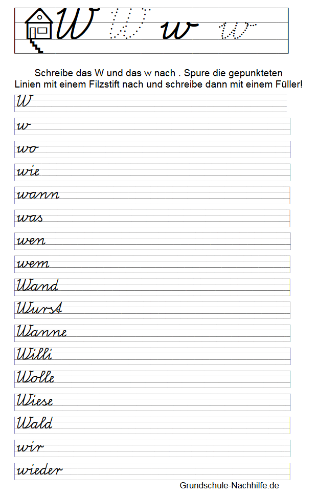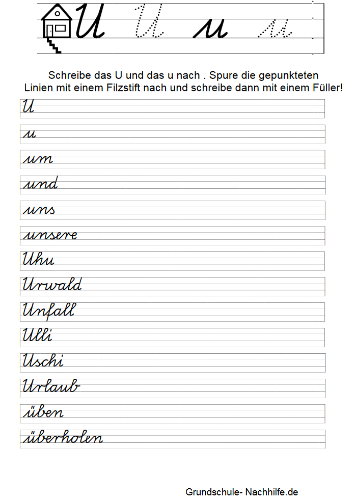 Zu Beginn der Übung sollte der Schüler immer erst den gepunkteten Buchstaben mit einem Filzstift nachspuren. Nachspuren heißt der Begriff, mit dem wir das Nachschreiben einer vorgegebenen Grundform (Buchstabe) bezeichnen. Zu Beginn der Linie finden wir ein Haus mit seinen drei bewohnbaren Etagen- Keller, Wohnstube, Dachboden. Unsere Buchstaben können in allen Etagen „wohnen“ (f) oder sie wohnen nur in der Wohnstube (a). In der Wohnstube und im Dachboden wohnen alle großen Buchstaben und einige kleine Schreibbuchstaben (l, k). Achten Sie auf die Einhaltung der entsprechenden „Wohnräume“!