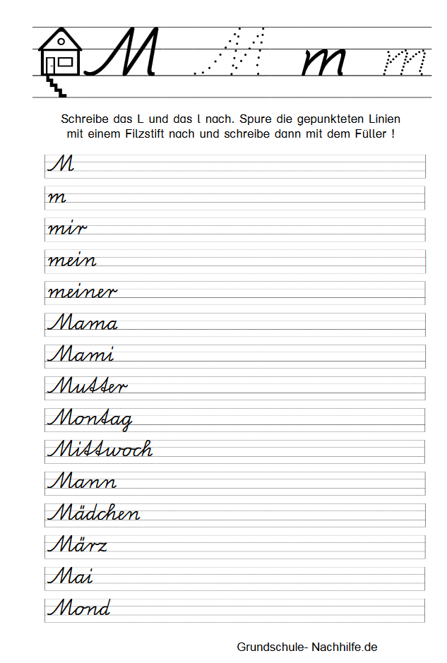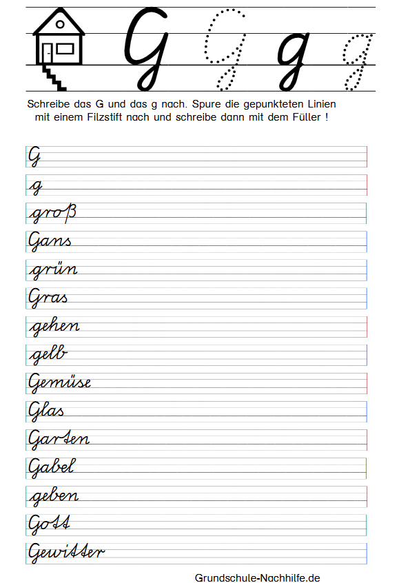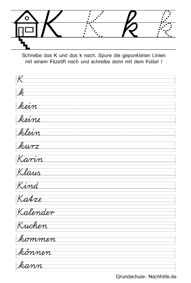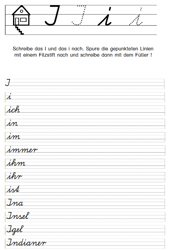 In der weiteren Reihenfolge des Alphabets schreiben wir heute in Schreibschrift das I, i. Zu Beginn der Übung sollte der Schüler immer erst den gepunkteten Buchstaben mit einem Filzstift nachspuren. Nachspuren heißt der Begriff, mit dem wir das Nachschreiben einer vorgegebenen Grundform (Buchstabe) bezeichnen. Zu Beginn der Linie finden wir ein Haus mit seinen drei bewohnbaren Etagen- Keller, Wohnstube, Dachboden. Unsere Buchstaben können in allen Etagen „wohnen“ (f) oder sie wohnen nur in der Wohnstube (a). In der Wohnstube und im Dachboden wohnen alle großen Buchstaben und einige kleine Schreibbuchstaben (l, k). Achten Sie auf die Einhaltung der entsprechenden „Wohnräume“!