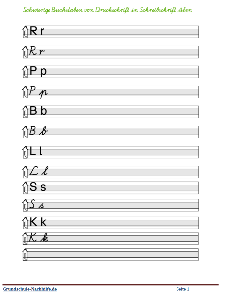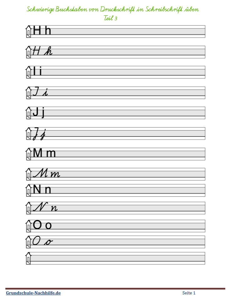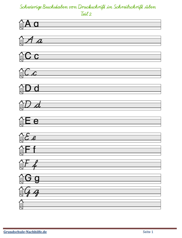 Häufig wird in Klasse 1 zuerst die Druckschrift der Buchstaben erlernt. Dabei bleibt dann oft im Verlauf der weiteren Schulzeit das Erlernen und die Festigung der Schreibschrift auf der Strecke. Unleserliche Handschrift ist dann das Ergebnis! Nutzen Sie hier das Angebot, die Schreibschriftbuchstaben noch einmal zu üben und zu festigen.