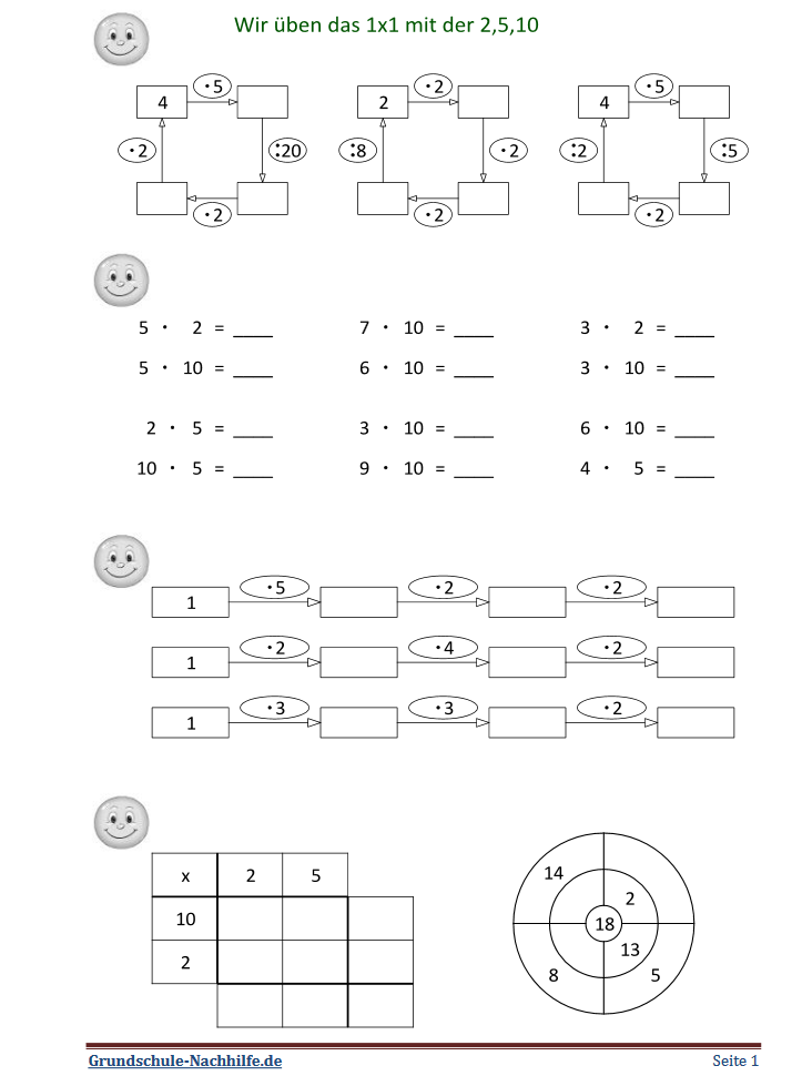 Arbeitsblatt Nachhilfe Mathe 1×1 mit der 2, 5, 10