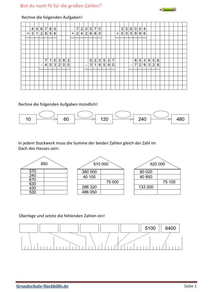 Arbeitsblatt Mathe Klasse 4,5 Rechnen im Bereich von Hunderttausend
