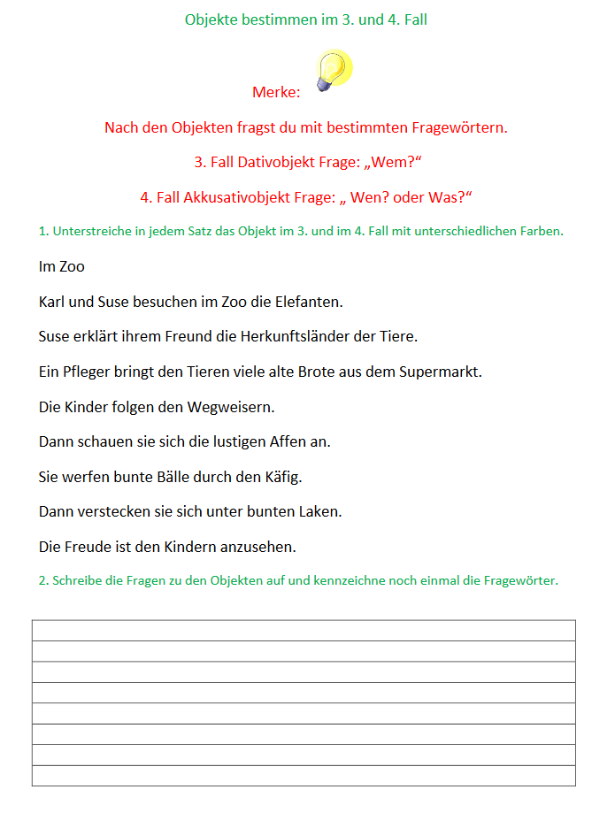 Arbeitsblatt Deutsch Klasse 3,4 Objekte im 3. und 4. Fall zuordnen