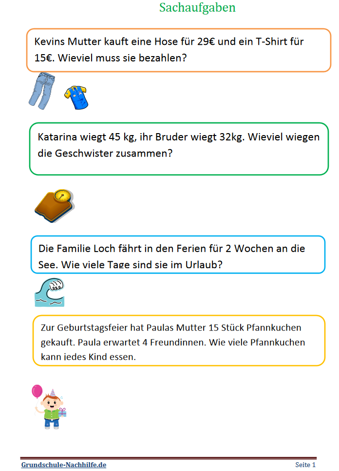 Das Zurechtfinden in einer einseitigen zusammenhängenden Sachaufgabe bereitet den meisten Schülern noch große Schwierigkeiten. Das Heraussuchen der Fakten und das gleichzeitige Verstehen und Rechnen ist mit dieser Aufgabe gut zu üben.